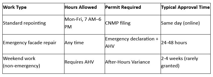 Property owners occasionally request evening or weekend repointing to minimize disruption to weekday business operations or to accommodate tenant schedules. The immediate response should be skepticism—NYC rarely grants after-hours variances for routine repointing.