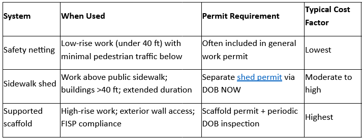 Public protection requirements escalate with building height. Sidewalk sheds become mandatory, not optional. The sheds must remain until final inspection approves removal. On a 12-story building, this might mean a full summer with scaffolding and sheds in place while crews methodically work from top to bottom. The visibility and duration make communication with commercial tenants and neighbors especially important.